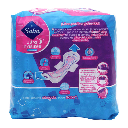 Toalla Femenina Saba Ultra Nocturna con Alas Paquete con 10 Piezas